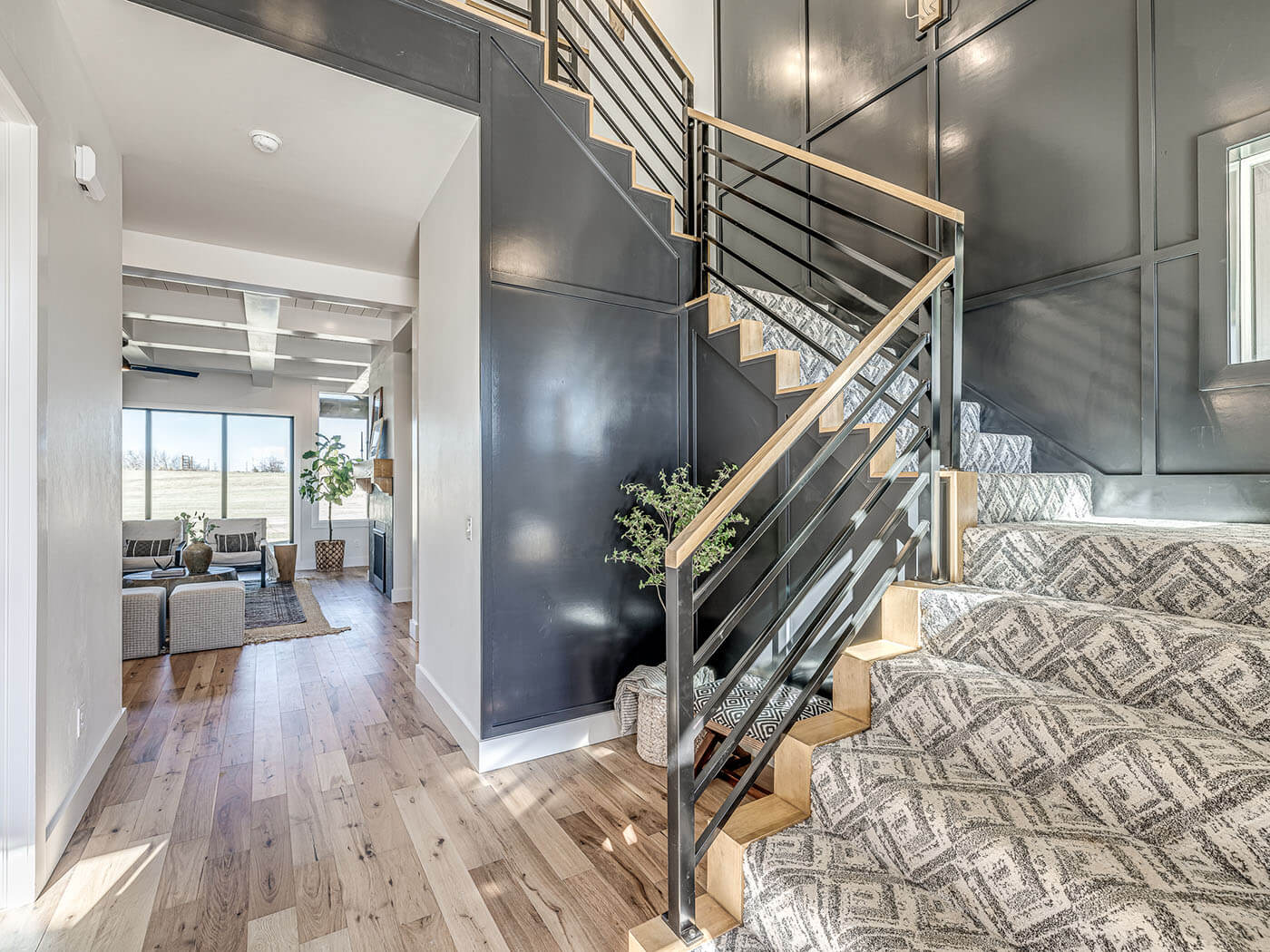 A staircase might seem purely functional, but we’re able to transform it into an architectural event. Dark wall tones make the space feel rich, patterned carpeting introduces movement, and sleek railings keep the design fresh and modern.