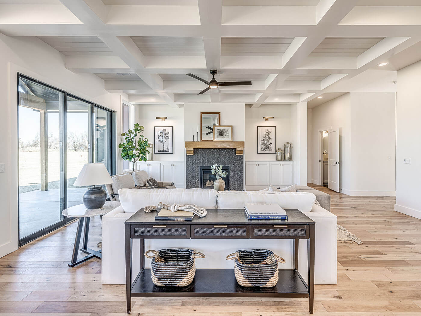 Step into the living room and notice how the coffered ceiling pulls your eye upward, giving the space rhythm and presence. Below, a stone fireplace grounds the room, its textures echoing Oklahoma’s rugged landscapes, while wide windows let in streams of light.