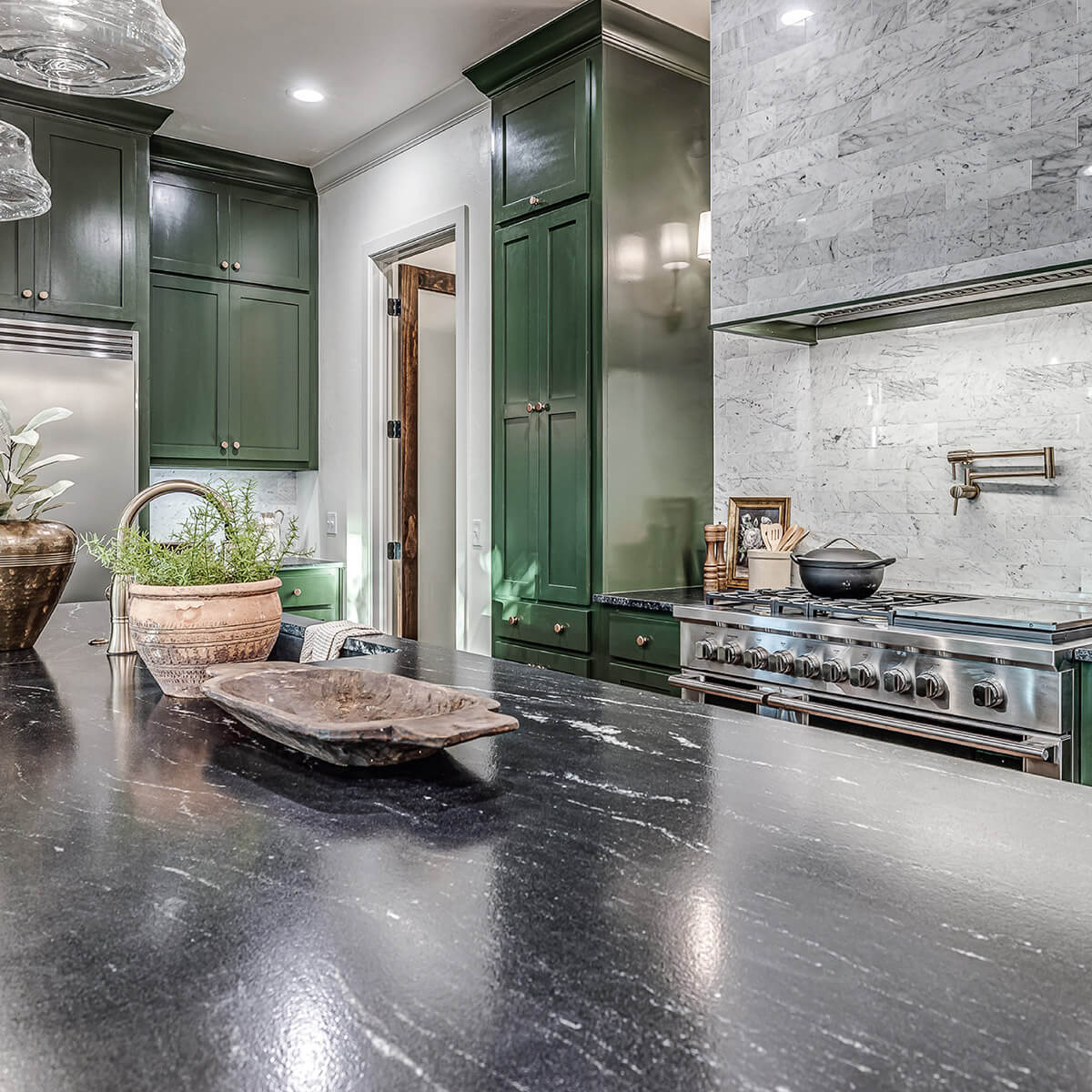 Heim kitchens are the heart of the home, places designed for cooking, gathering, and making memories. Deep green cabinetry adds richness and personality, while islands serve as stages for everything from morning coffee to holiday feasts. Lighting is deliberate, chosen not just to illuminate but to create atmosphere.