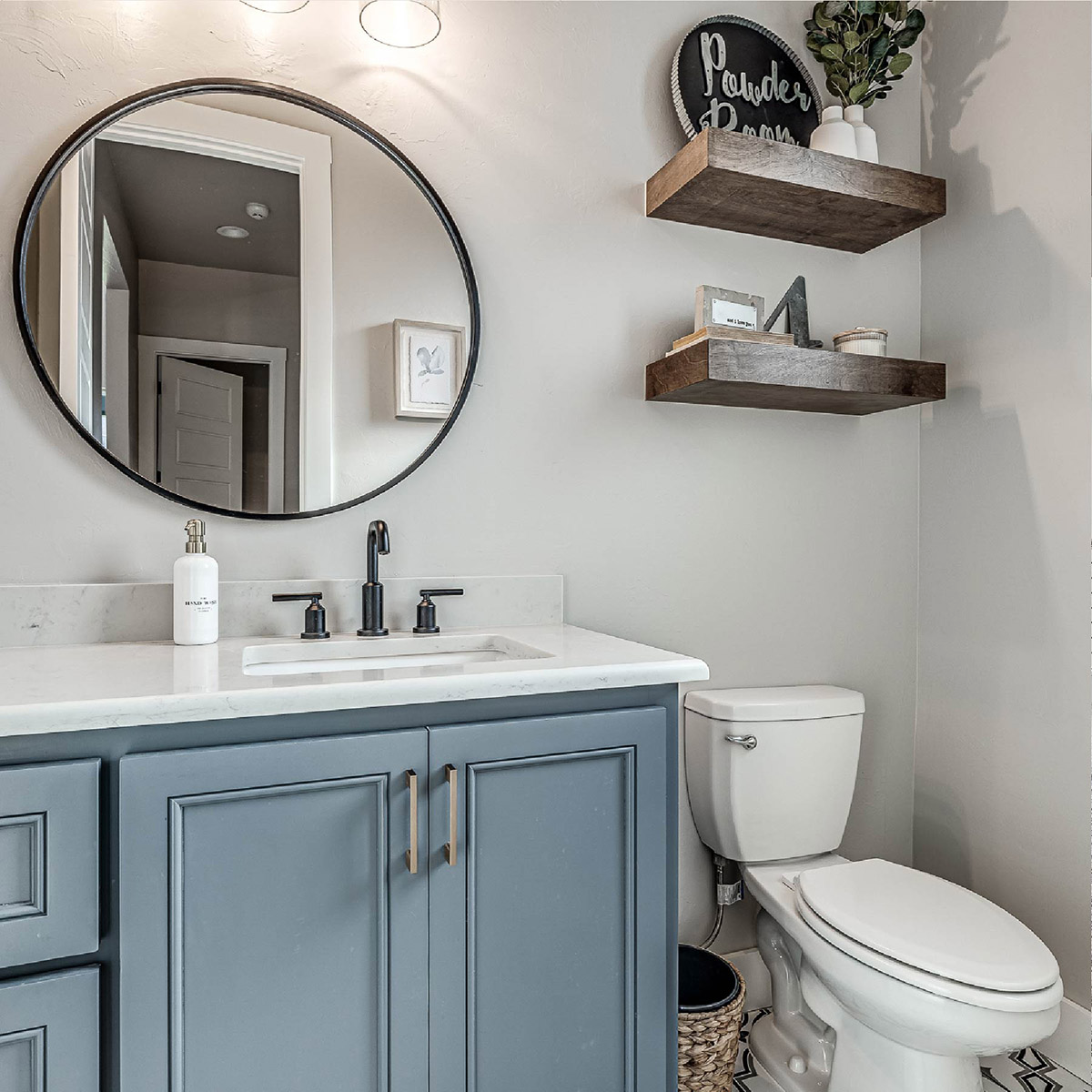 Small spaces are often overlooked, but we refuse to treat them as afterthoughts. In this powder room, floating wood shelves bring warmth, carefully selected fixtures add polish, and a custom vanity ensures utility never sacrifices design.